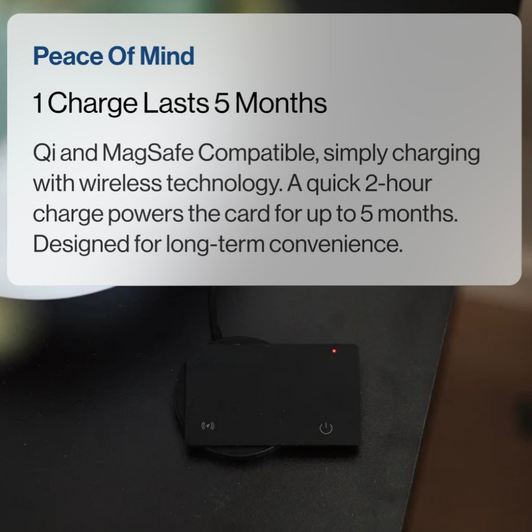 Yes, the VAULT GPS Tracking Card features wireless charging capability for your convenience. Simply place it on a compatible charging pad to recharge when needed. A full charge lasts up to 5 months, indicated by a color-changing LED light. Reusable multiple times, more economical.